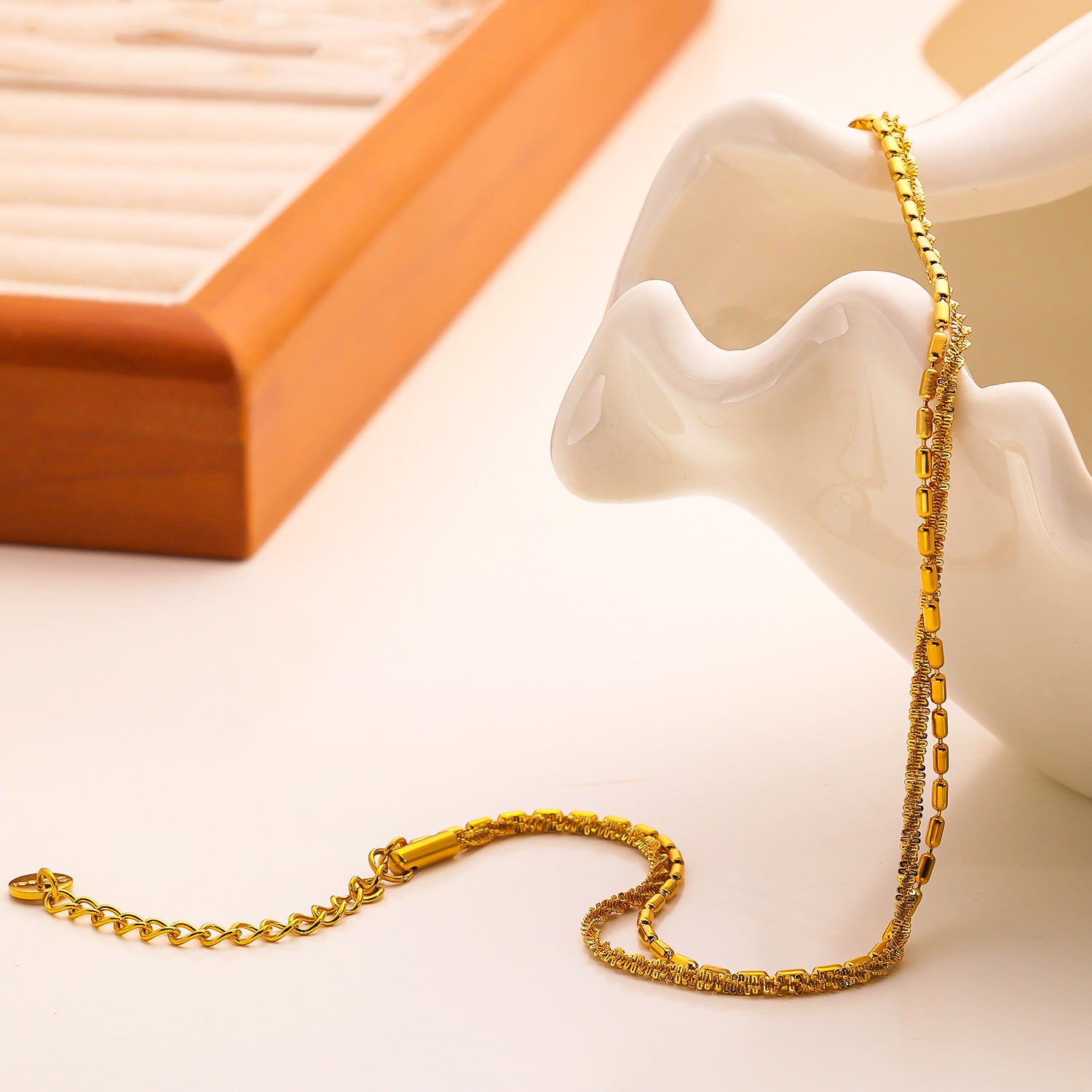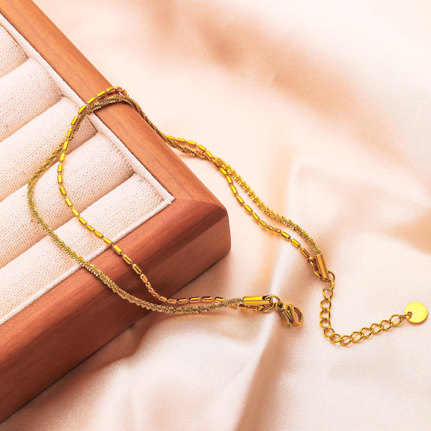 A symbol of balance and grace — the Dual Aura Bracelet features two interwoven chains that move in perfect harmony. Crafted from anti-tarnish 316L stainless steel and finished in rich 18K PVD gold plating, it embodies understated luxury built to last.